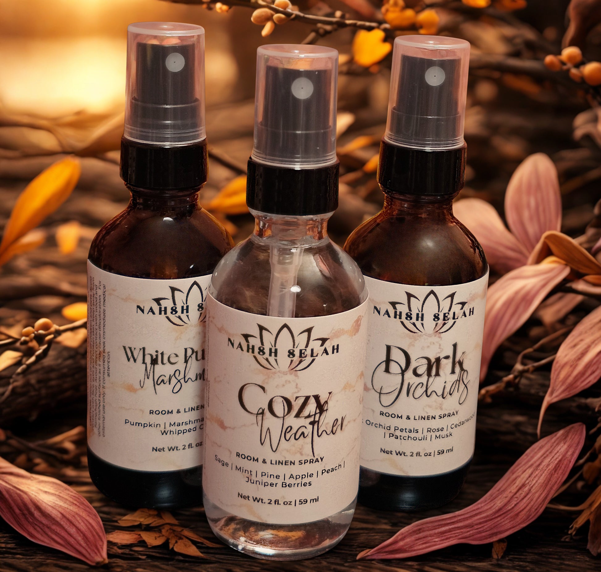 Transform your space with our Fall Collection Room & Linen Sprays - seasonal scents crafted to bring comfort, warmth, and a touch of magic to everyday moments. Whether spritzed on pillows, blankets, or the air around you, each fragrance invites you to slow down and savor the stillness of fall.